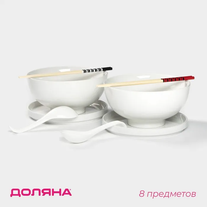 Набор посуды для рамена Доляна, 8 предметов: миска 1.6 л, тарелка d=20 см, 2 ложки, 2 пары палочек, фарфор, белый