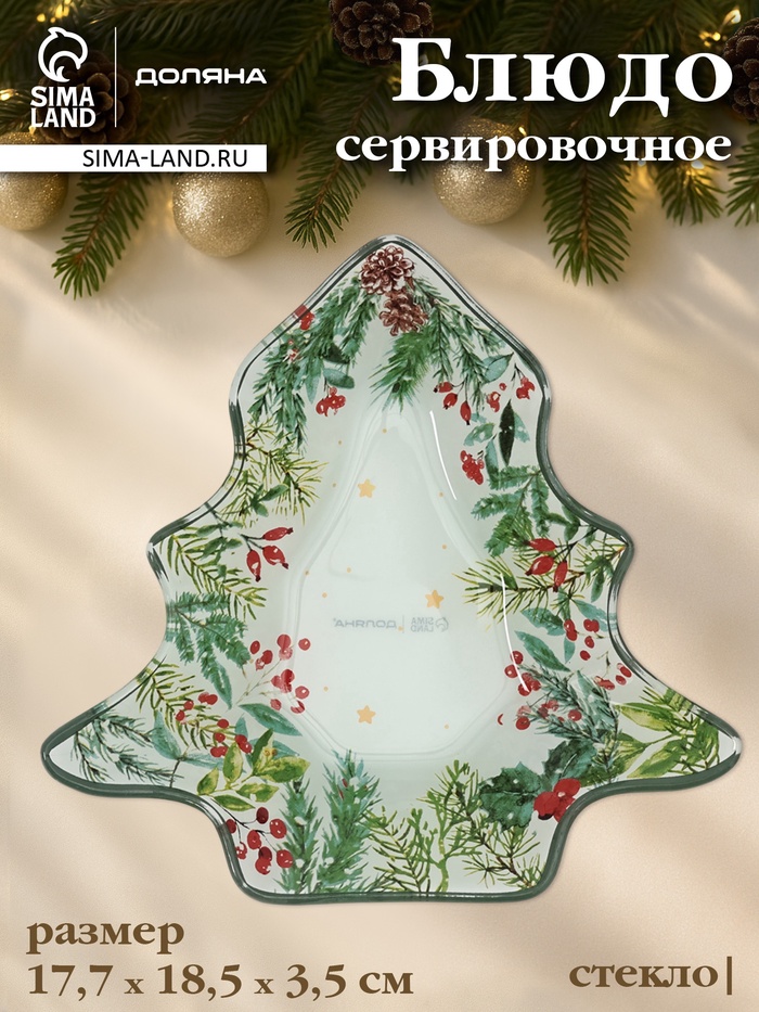Блюдо новогоднее сервировочное Доляна «Еловые ветки», 17.7×18.5×3.5 см, стекло, белое, зелёное