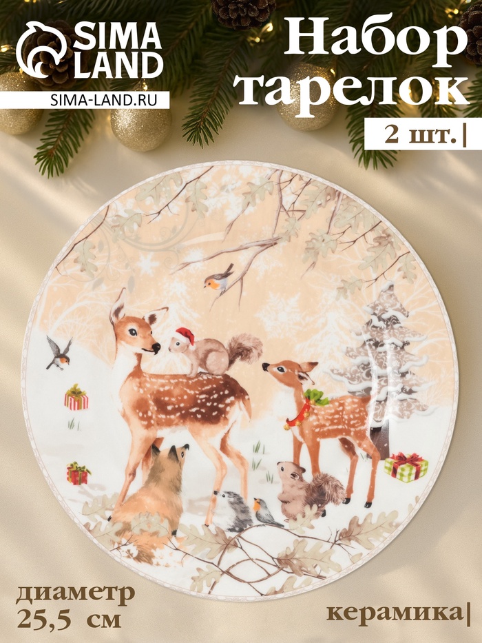 Набор тарелок новогодних «Лесное чудо», 2 шт., d=25.5 см, керамика, подарочная упаковка, бежевый