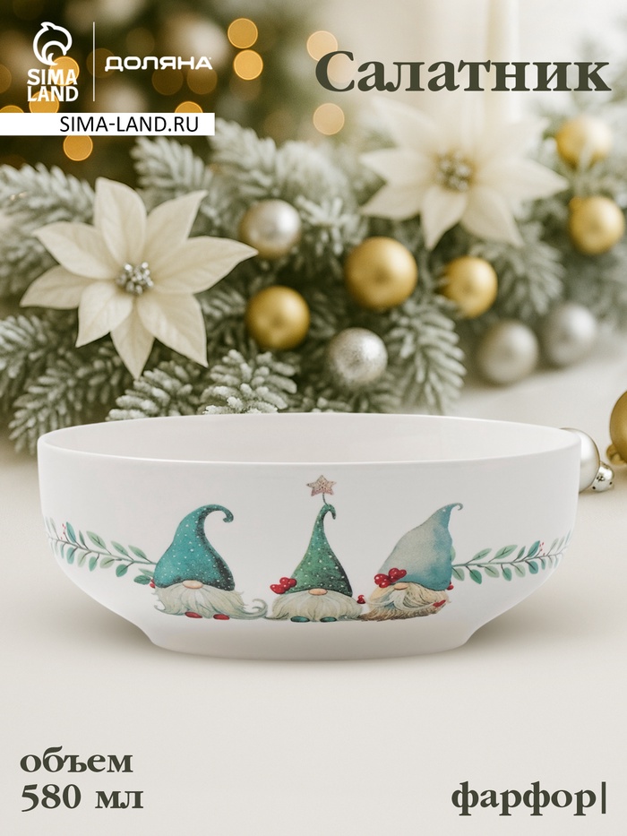 Салатник новогодний Доляна «Домашние гномики», 580 мл, 15.5×6 см, фарфор, белый