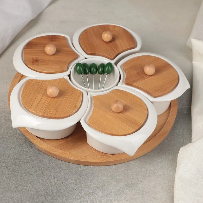 Набор мисок для снэков на деревянной подставке «Эстет», 5 мисок d=10 см, соусник d=8 см, 5 шпажек, керамика, белый