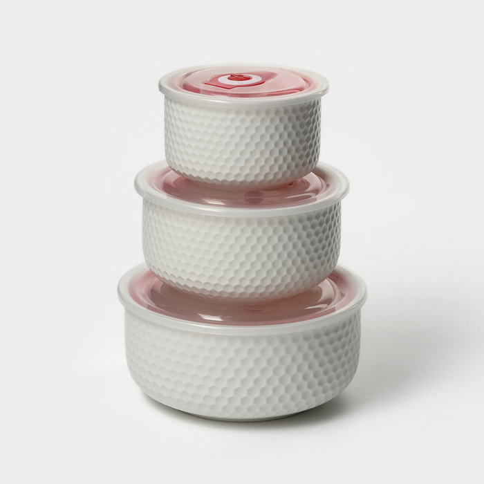 Набор салатников керамических с вакумными крышками «Ромбики», 3 предмета: 300/550/900 мл, цвет белый
