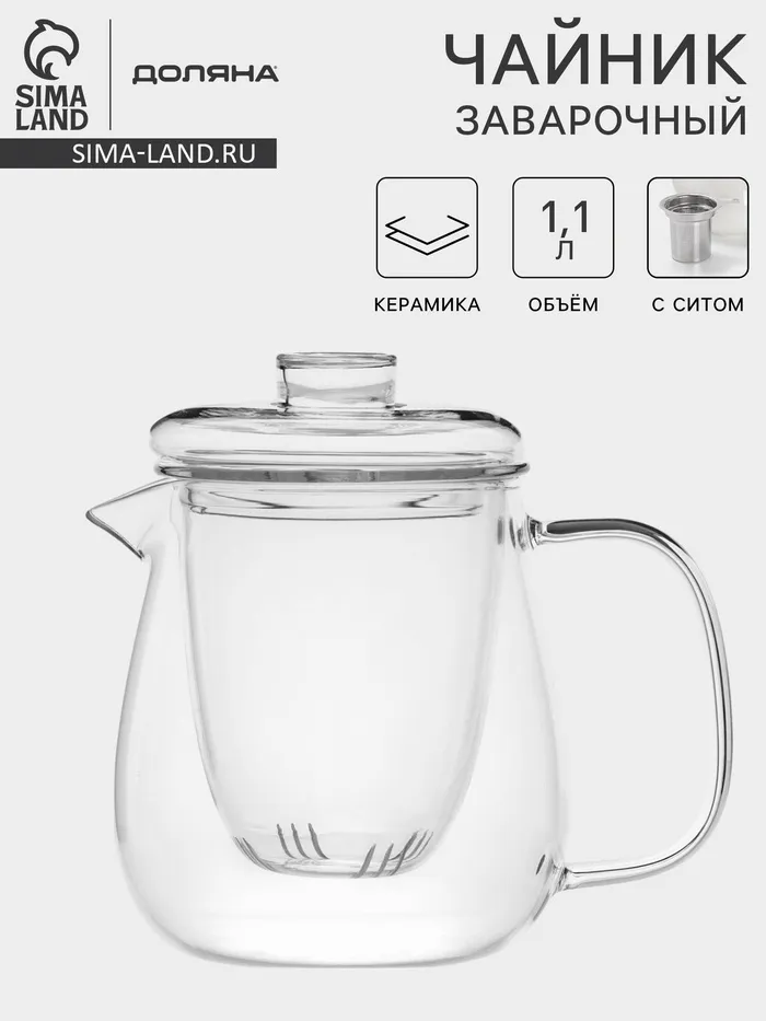Заварочный чайник Доляна «Бохо», 750 мл, 15×11×14 см, со стеклянным ситом и крышкой, стекло, прозрачный