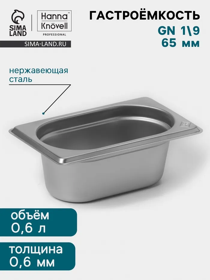 Гастроёмкость GN 1/9 Hanna Knövell, 65 мм, 176×108×65 мм, толщина 0.8 мм, нержавеющая сталь
