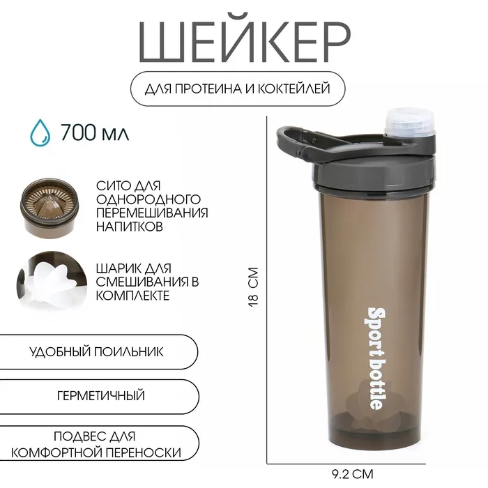 Шейкер спортивный для коктейлей, спортивного питания, 700 мл, PowerPlus, 18х9.2 см, чёрный