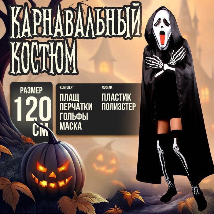 Карнавальный костюм «Хэллоуин чёрный», плащ 120 см, маска, гольфы, перчатки