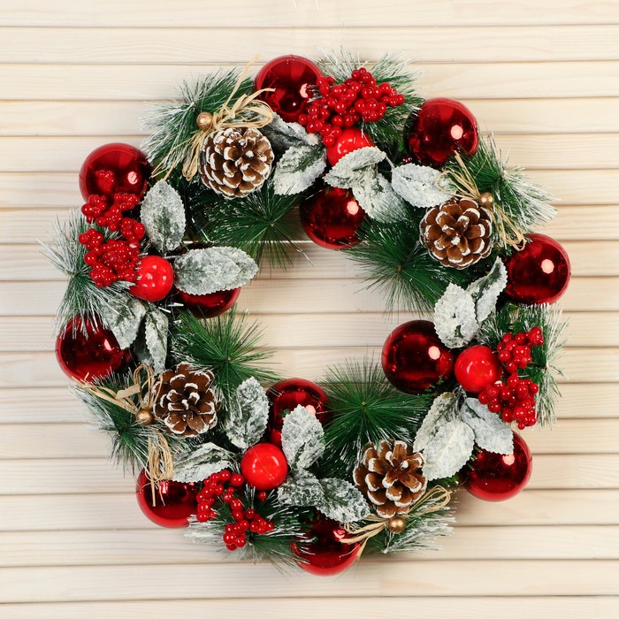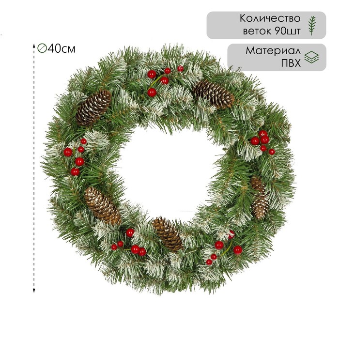 Венок новогодний d=40 см «ЕлкиТорг. Нарядный» заснеженный, декор шишки и ягоды, 90 ПВХ веток