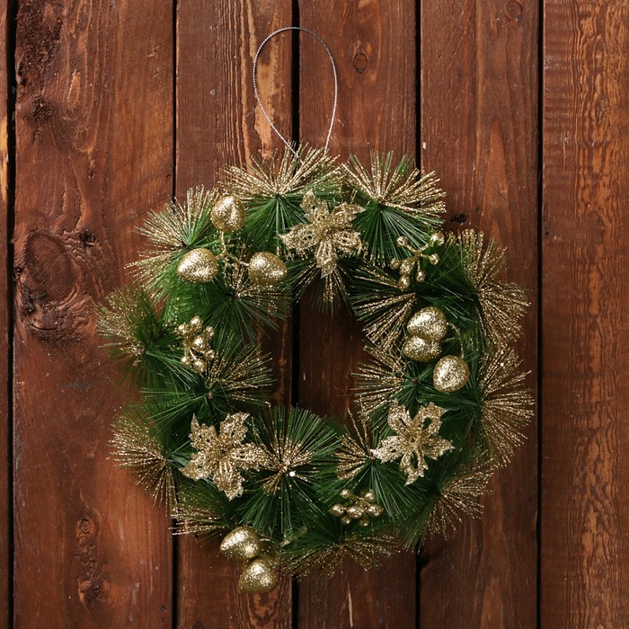 Новогодний венок d=20 см «Зимнее волшебство. Золотые цветы на зелёном»