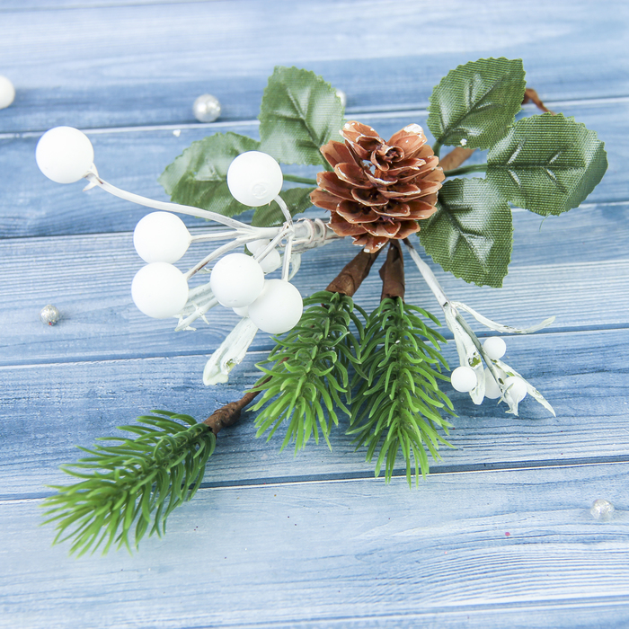 Еловая ветка декоративная «Зимнее волшебство. Чудо», пластик, белые ягоды, шишка, 24 см