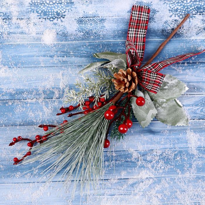 Еловая ветка декоративная «Зимнее волшебство. Очарование», шишка, ягоды, хвоя, бантик, 28 см