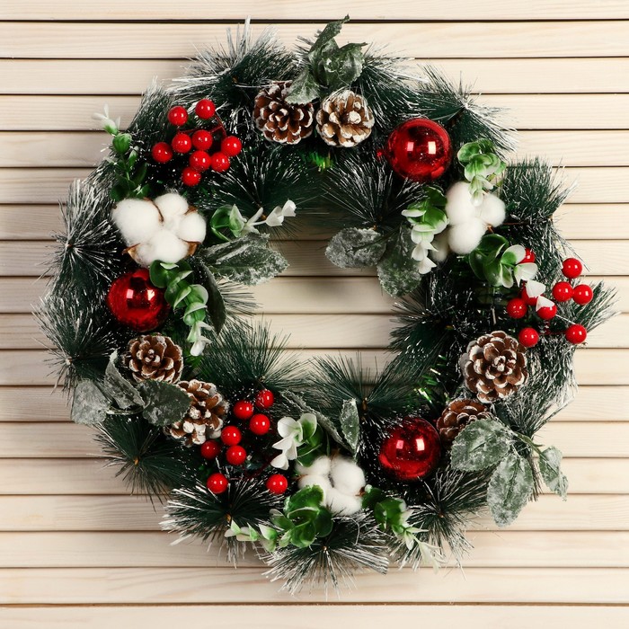 Венок новогодний d=60 см, «Нарядный» с декором, заснеженный, 115 веток