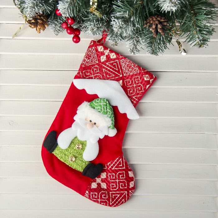 Подвеска на ёлку «Носок - Дед Мороз в длинном колпаке», мягкая, 18×27 см, зелёный/красный