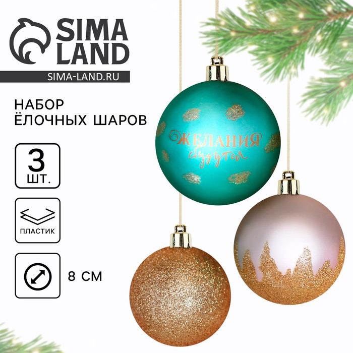 Шары ёлочные новогодние «Желания сбудутся!», на Новый год, пластик, d=8, 3 шт., розовые, тиффани, золотые