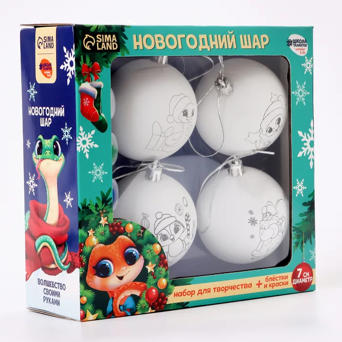 Ёлочные шары под раскраску на новый год «Зимняя сказка. Змея», d = 7 см, 4 шт, набор для творчества
