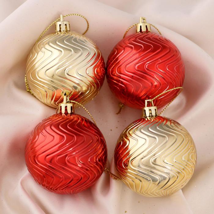 Ёлочные игрушки «Волнистые грани», шары новогодние, набор 4 шт., d=6 см, красно - золотистый