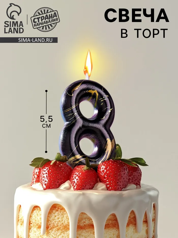 Свеча в торт «Черный мрамор», цифра 8, 5.5 см