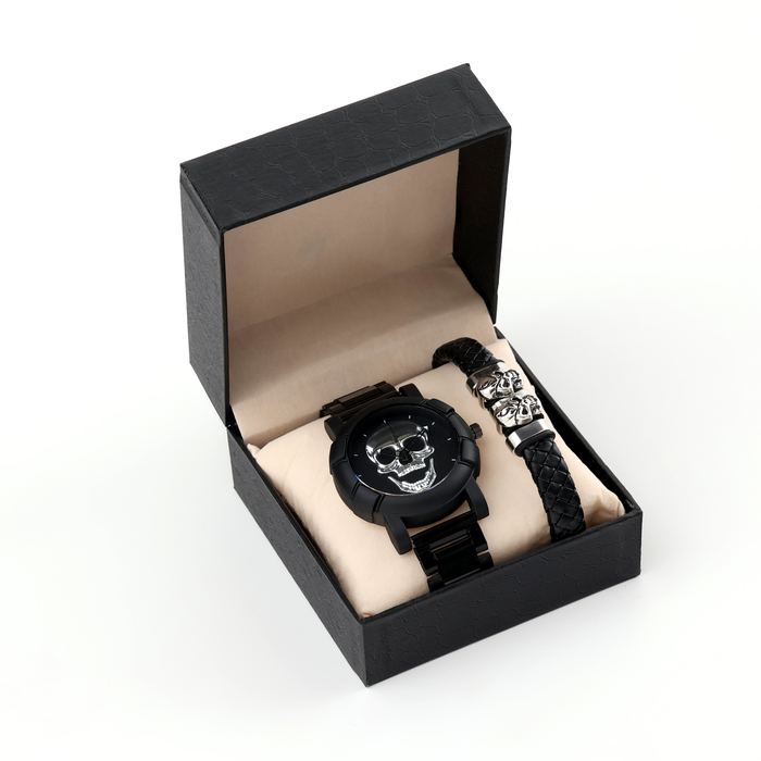 Мужской подарочный набор «Череп» 2 в 1: наручные часы, браслет, серебристый
