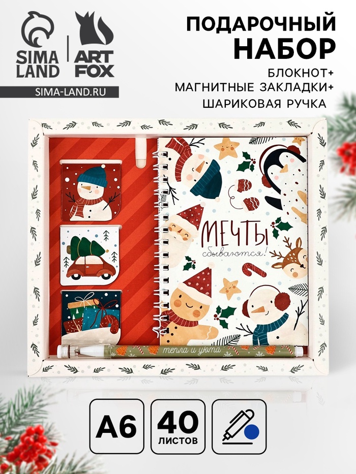 Подарочный набор новогодний, блокнот А6, 40 л., ручка пластик, магнитные закладки 3 шт. «Акварель»