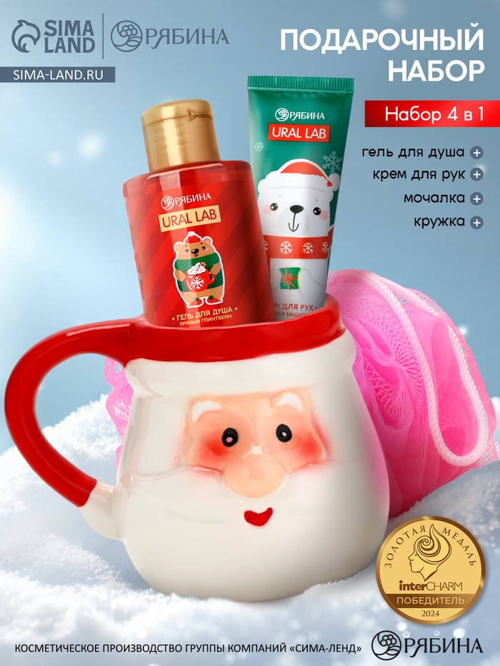 Подарочный набор новогодний «Дед Мороз», гель для душа, кружка, мочалка и крем для рук, URAL LAB
