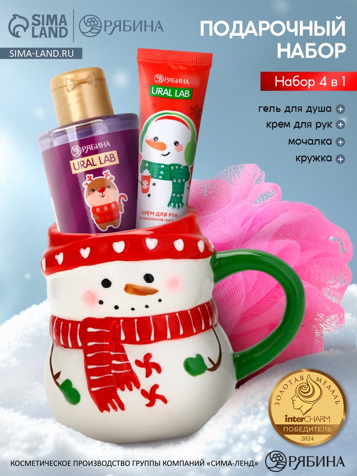 Подарочный набор новогодний «Снеговик», гель для душа, кружка, мочалка и крем для рук, URAL LAB