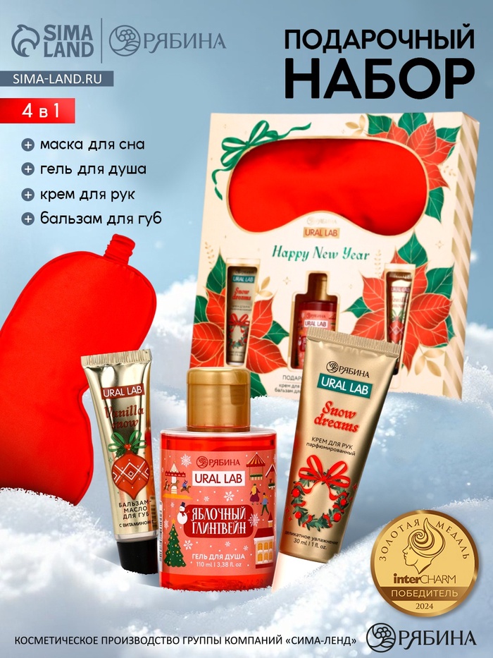 Новогодний подарочный набор косметики: гель для душа, крем для рук, бальзам для губ, маска для сна, URAL LAB
