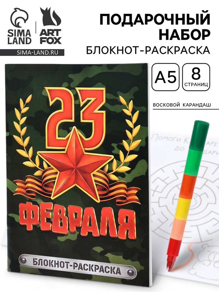 Подарочный набор «С 23 февраля», блокнот-раскраска А5, 8 страниц и восковой карандаш