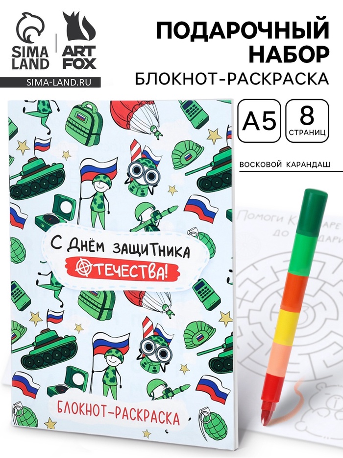 Подарочный набор «С днем защитника отечества», блокнот-раскраска А5, 8 страниц и восковой карандаш