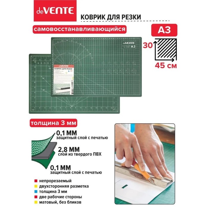 Коврик для резки макетный A3 deVENTE, 3 мм, непрорезаемый, двусторонний, трёхслойный