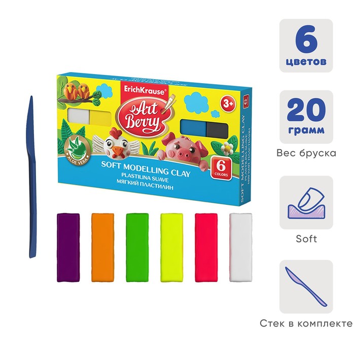 Пластилин мягкий (восковой) ErichKrause ArtBerry, 6 цветов, 120 г, с алоэ вера, со стеком, в коробке