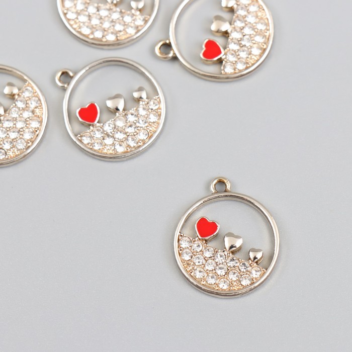 Металлический элемент, декоративная подвеска « Арт узор. Три сердца в круге», стразы, серебро, 0.2×1.8×2.1 см