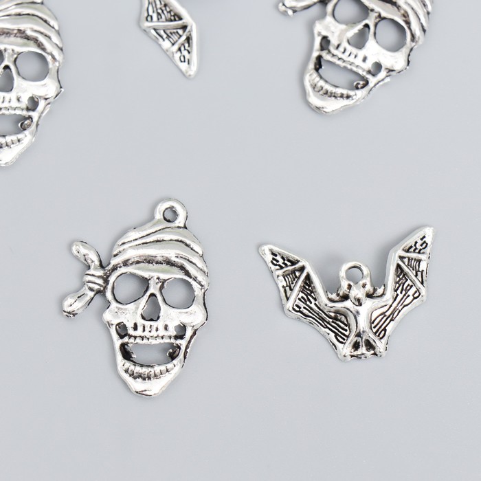 Декор для творчества металл «Череп и летучая мышь», серебро, набор 6+6 шт., 1.6×2.3 2.7×1.9 см