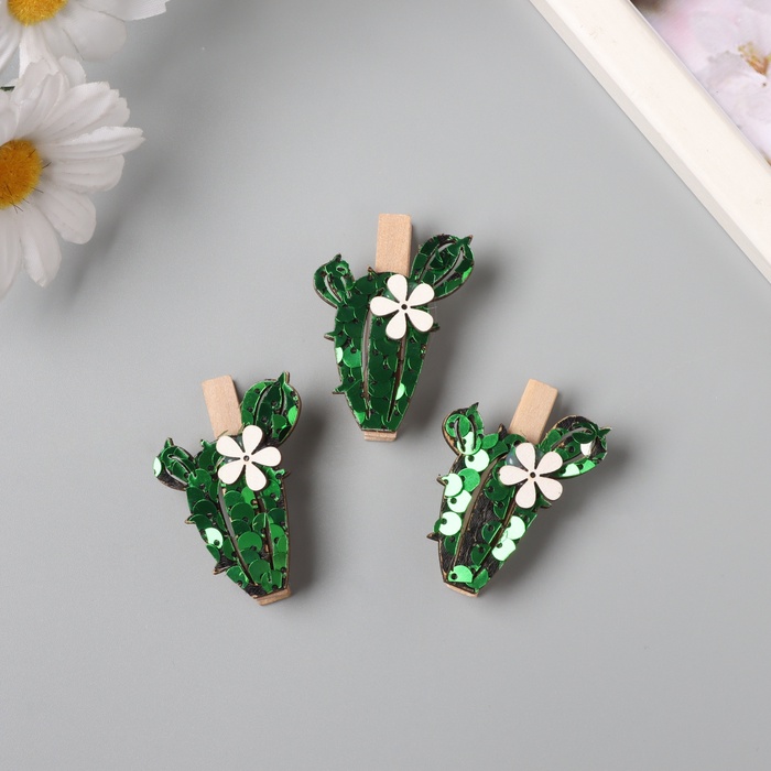 Декор для творчества дерево «Прищепка. Кактус с цветком», пайетки, набор 3 шт., 1.5×4×4.8 см
