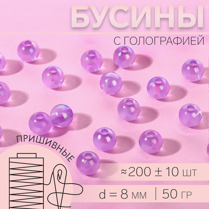 Бусины для декора, с голографией, d=8 мм, 50 г, сиреневые