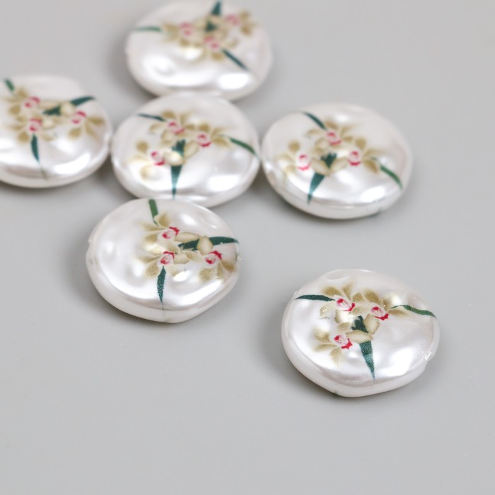 Бусина для творчества пластик «Жемчужный плоский круг с орхидеями», 0.5×1.6×1.6 см