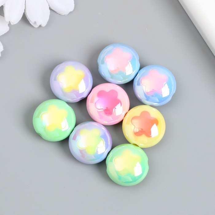 Бусина пластик «Плоский шарик. Цветочек», глянец перламутр, 1.7×1.7 см, МИКС