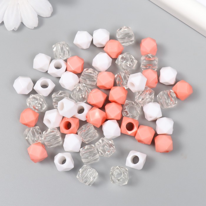 Бусины пластик «Кристалл многогранник. Коралловый, белый, прозрачный», набор 30 г, 1×1×1 см