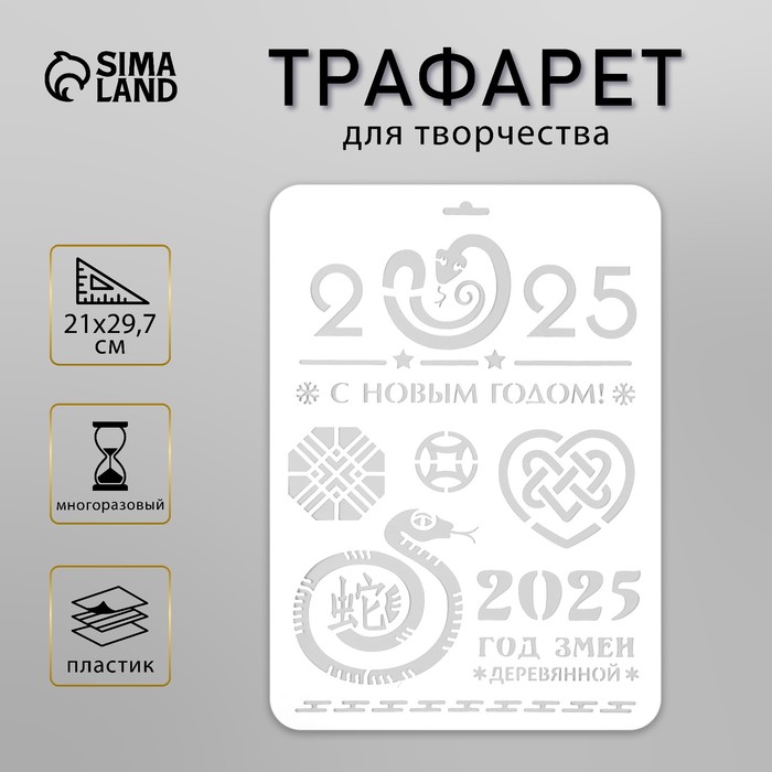 Пластиковый трафарет для творчества «С Новым годом 2025. Деревянная змея», шаблон, размер А4