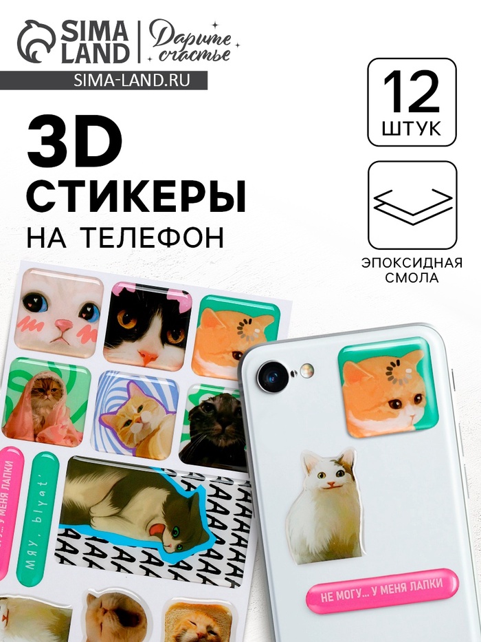 Объёмные 3D стикеры на телефон «Коты», 12 шт.