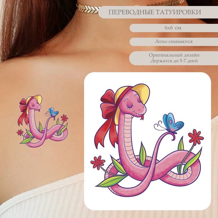 Переводная тату на тело цветная «Змейка в шляпке на полянке», 6×6 см
