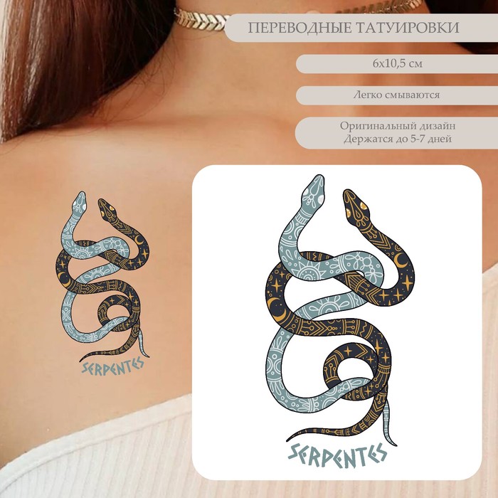 Переводная тату на тело цветная «Две змеи. Небесные узоры», 10.5×6 см