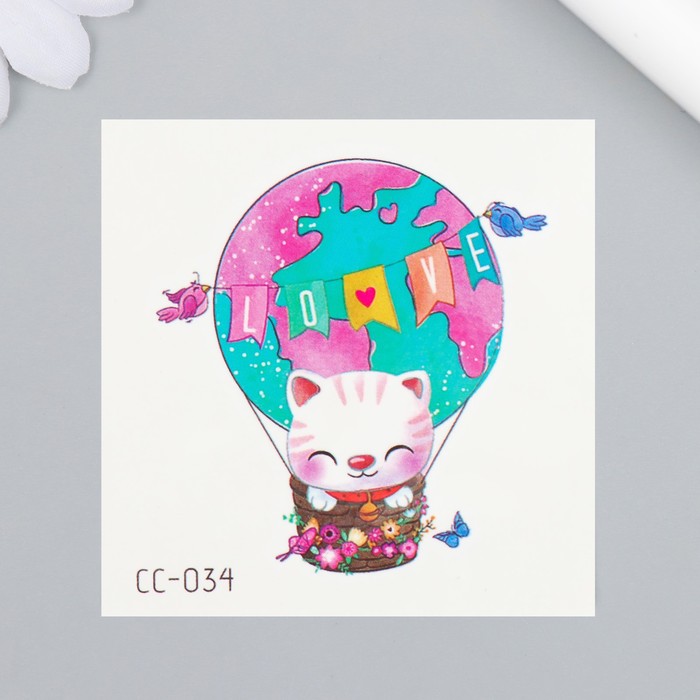 Переводная тату на тело цветная «Котик на воздушном шаре», 6×6 см
