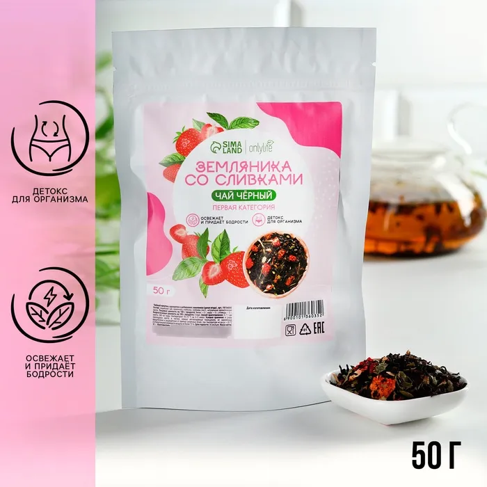 Чай чёрный с земляникой со сливками, освежает и придаёт бодрость, детокс для организма, 50 г.