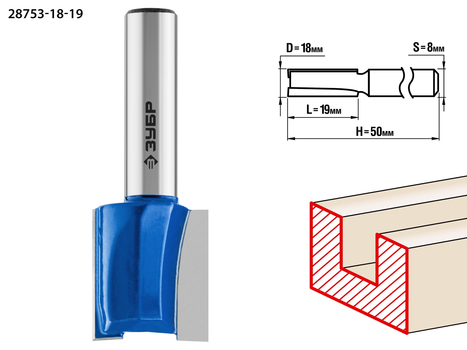 ЗУБР 18 x 19 мм, хвостовик 8 мм, фреза пазовая прямая, Профессионал (28753-18-19)