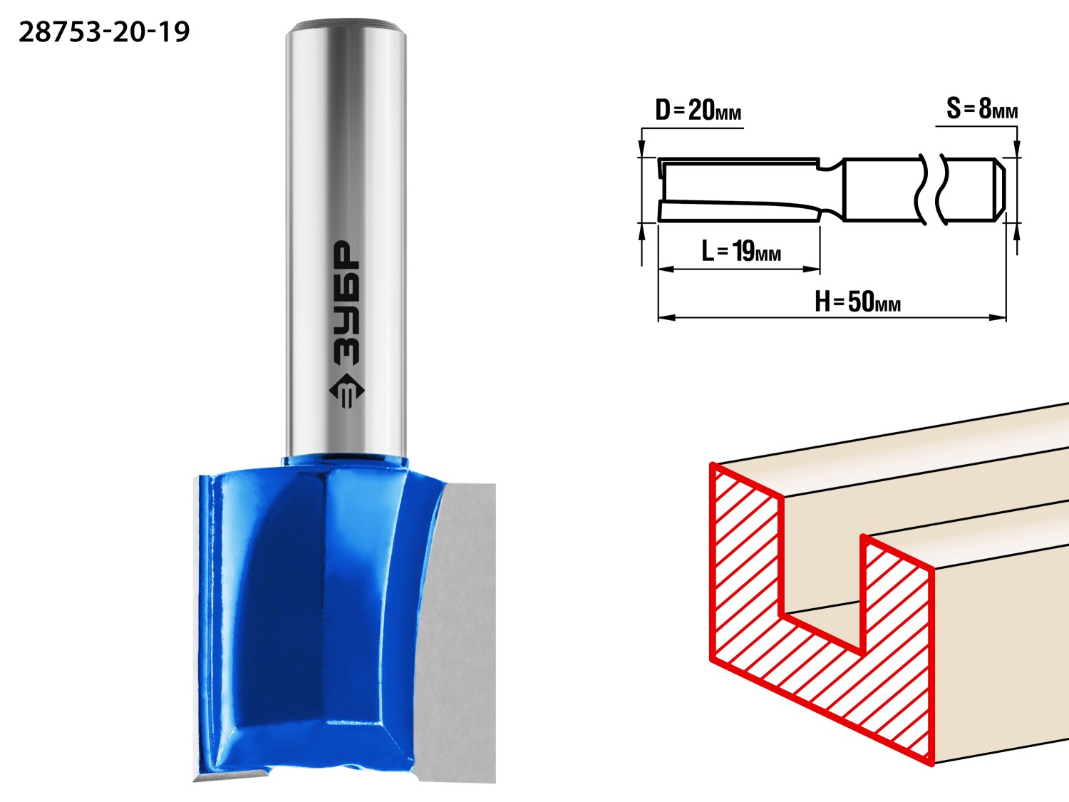 ЗУБР 20 x 19 мм, хвостовик 8 мм, фреза пазовая прямая, Профессионал (28753-20-19)