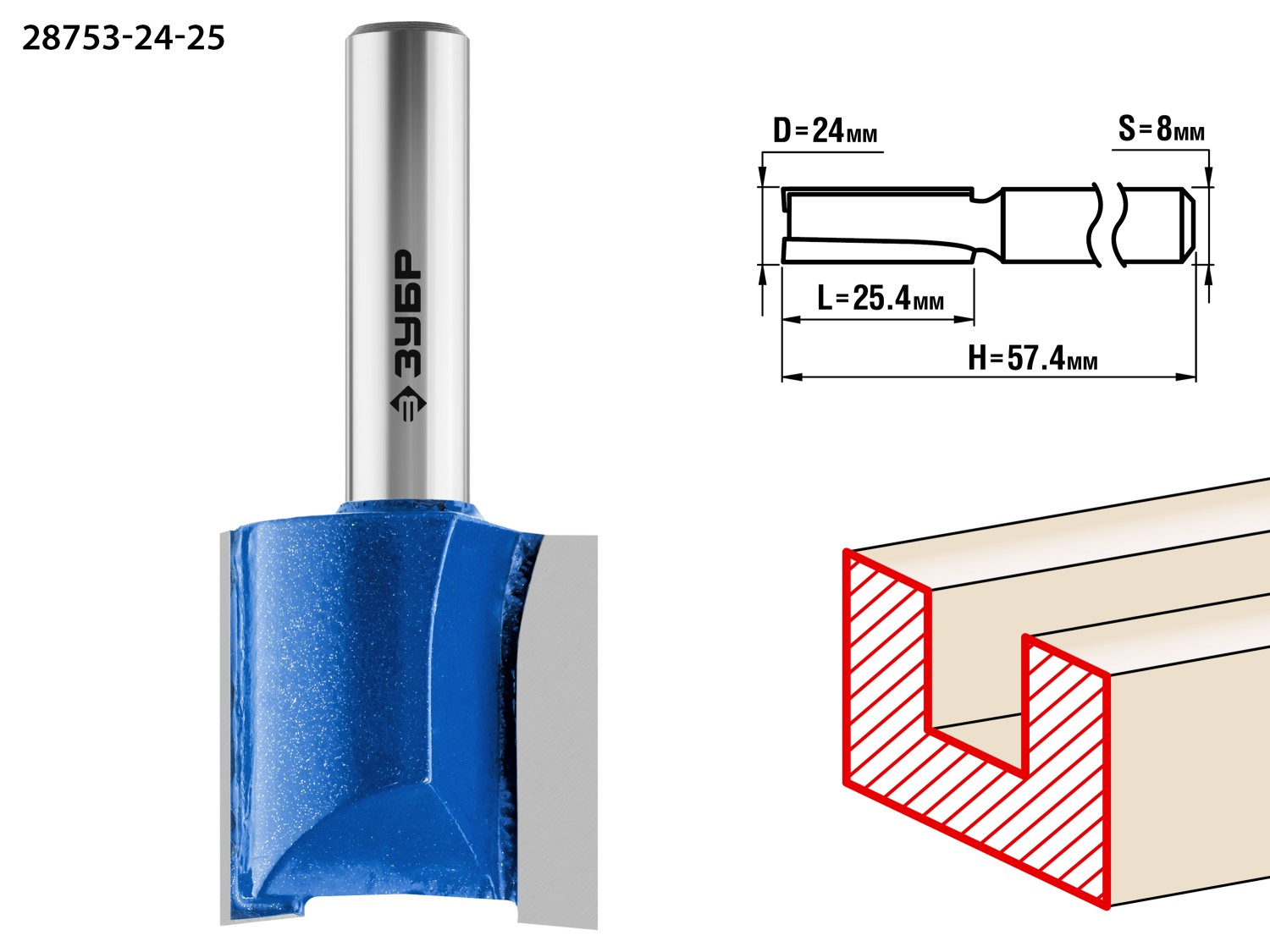 ЗУБР 24 x 25 мм, хвостовик 8 мм, фреза пазовая прямая, Профессионал (28753-24-25)