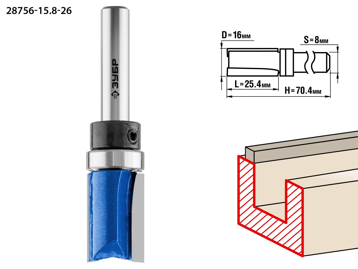 ЗУБР 15.8 x 25.4 мм, хвостовик 8 мм, фреза пазовая прямая с верхним подшипником, Профессионал (28756-15.8-26)