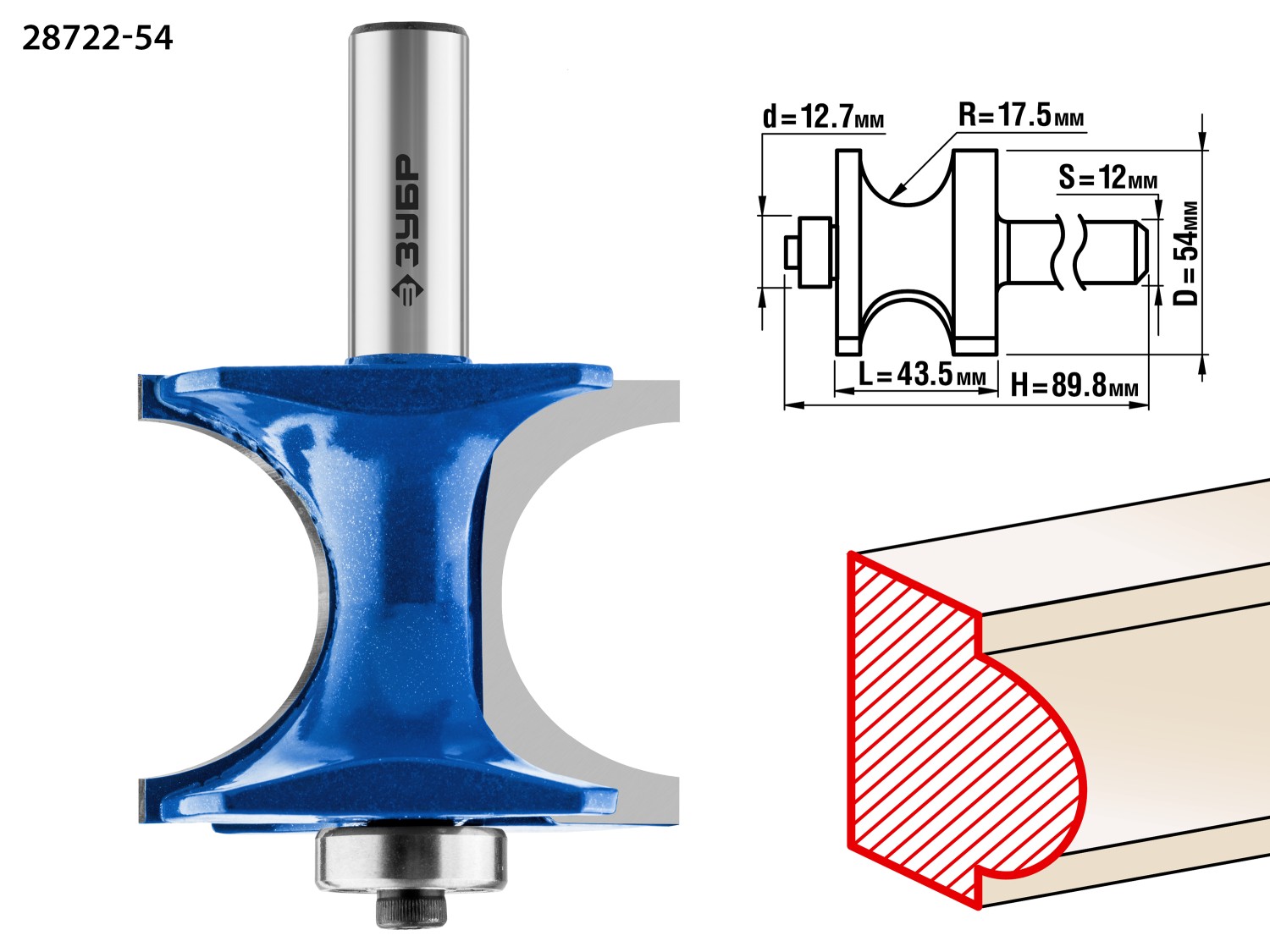 ЗУБР 54 x 51 мм, радиус 12.7 мм, фреза полустержневая с подшипником, Профессионал (28722-54)