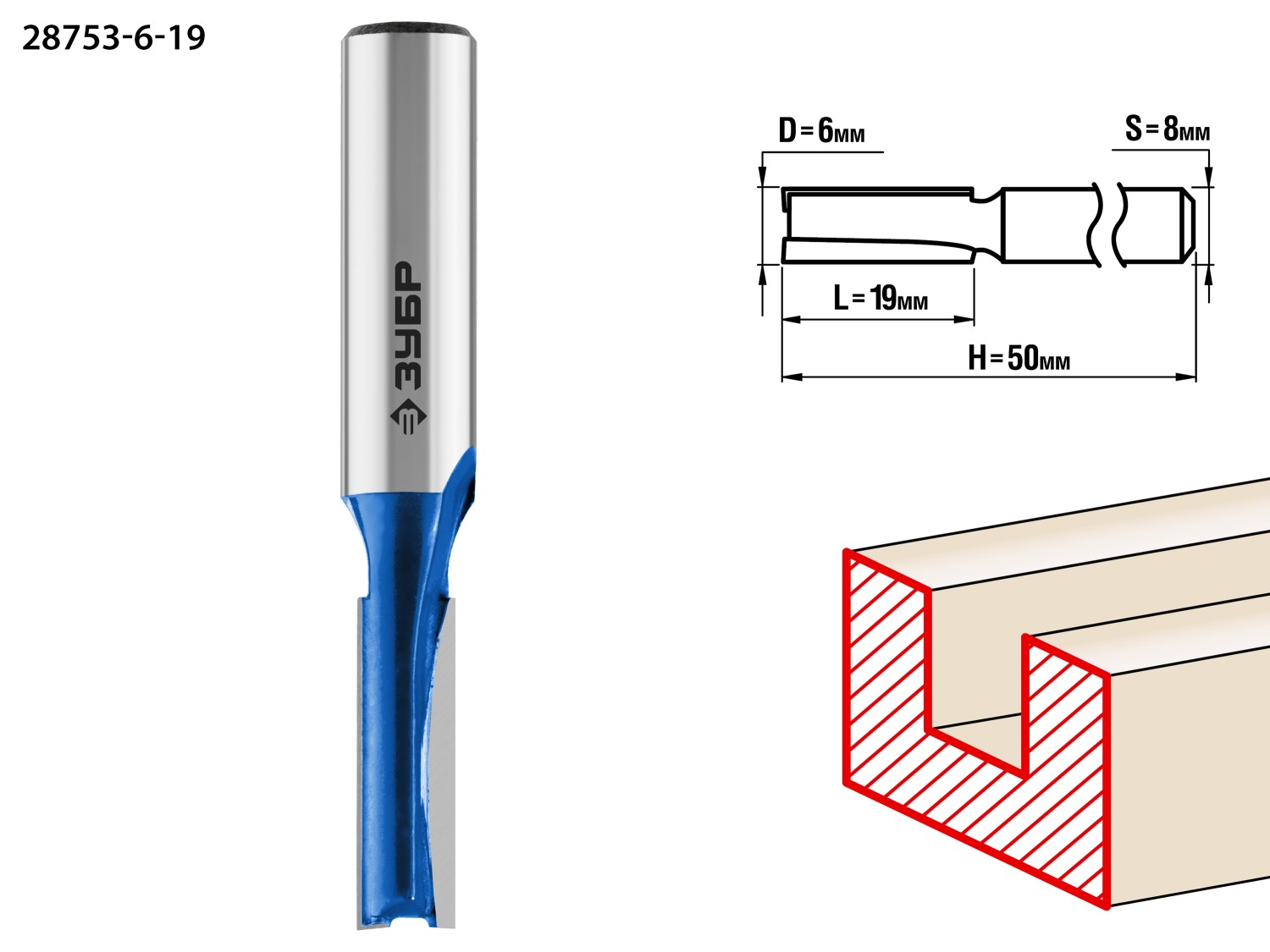 ЗУБР 6 x 19 мм, хвостовик 8 мм, фреза пазовая прямая, Профессионал (28753-6-19)