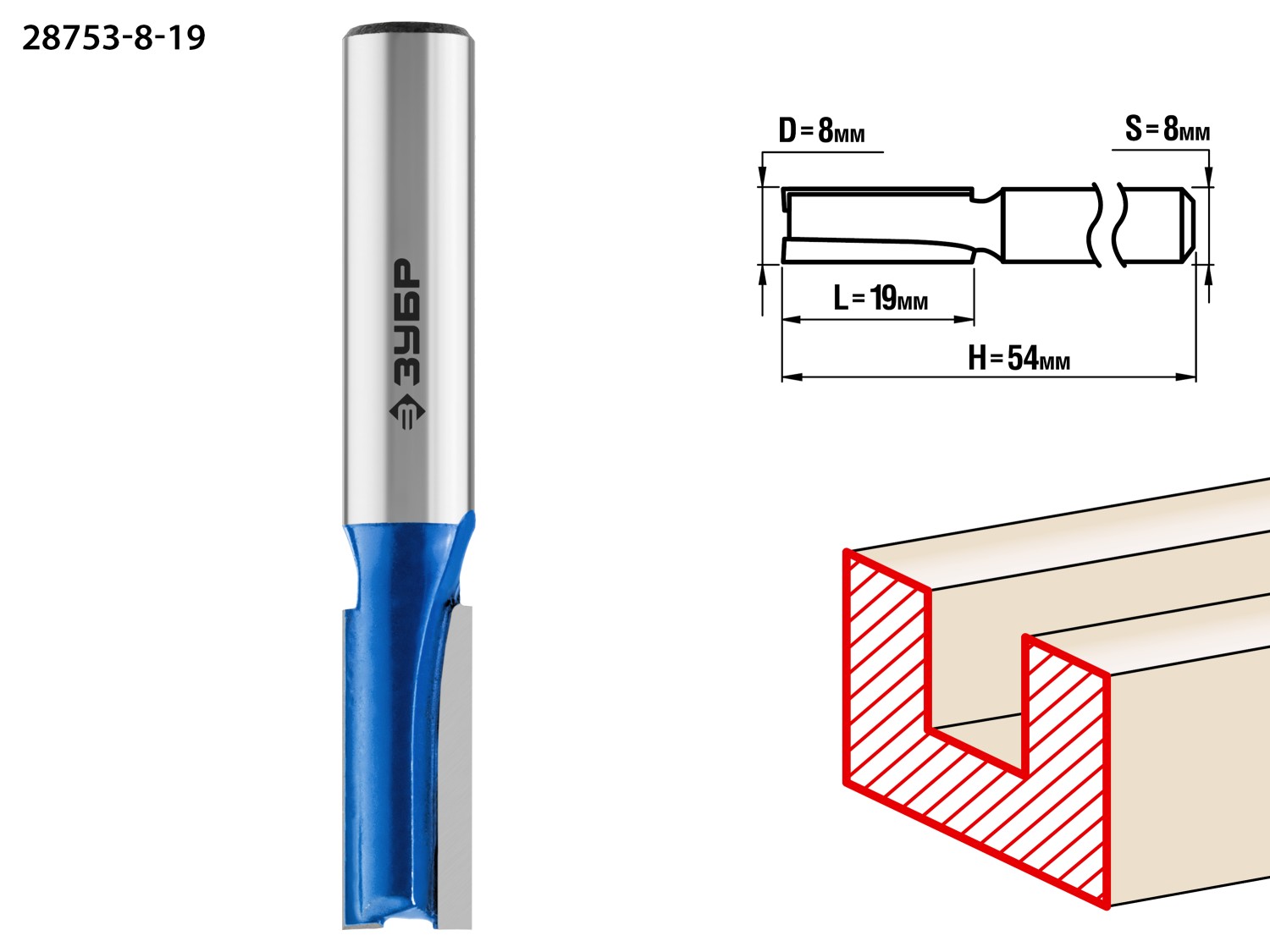 ЗУБР 8 x 19 мм, хвостовик 8 мм, фреза пазовая прямая, Профессионал (28753-8-19)
