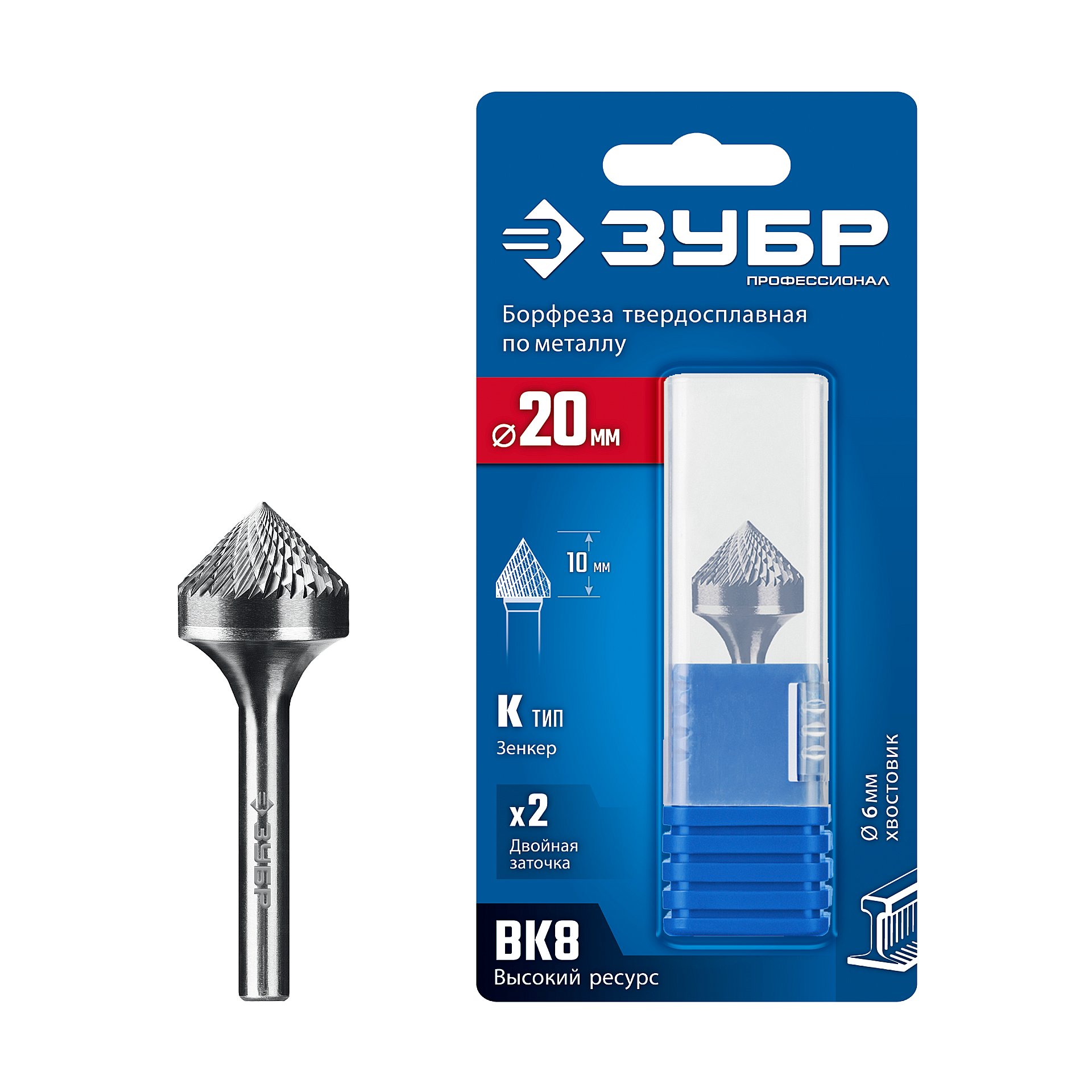 ЗУБР 20х10 мм, тип K (зенкер с вершиной 90°), хв-к 6 мм, твердосплавная борфреза, ПРОФЕССИОНАЛ (28809-20-10)